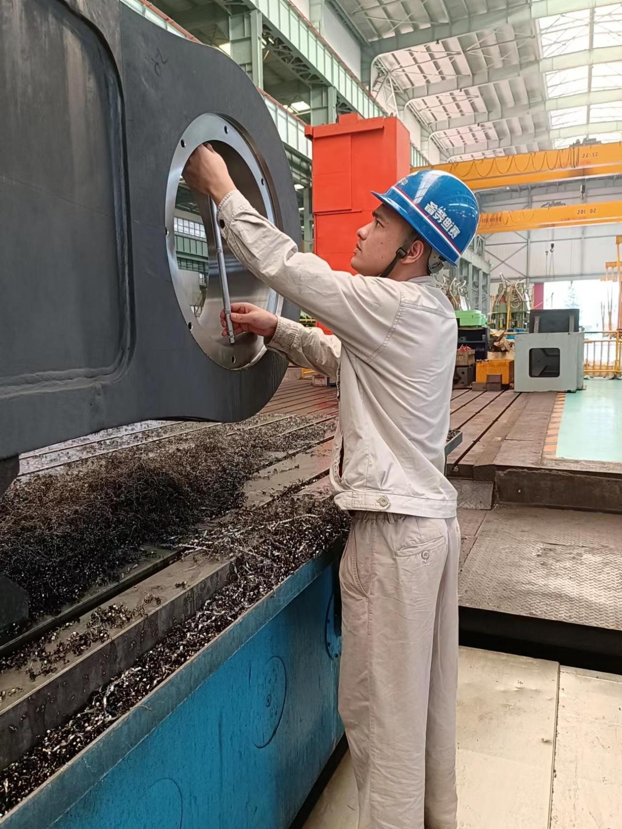 在公司首次承制的“傾動減速機(jī)”項(xiàng)目中,其箱體中心孔為直徑φ1750毫米,業(yè)內(nèi)還從未在鏜床上加工過如此大規(guī)格的孔。我們憑借多年經(jīng)驗(yàn),并多方考慮公司設(shè)備的特性,提出了“平旋盤+卡座+標(biāo)準(zhǔn)鏜盤”的加工方法,自主設(shè)計(jì)制作工裝,終于趕跑了這個(gè)“攔路虎”,完成了公司首次φ1500mm以上鏜孔的加工。這些核心裝備在客戶那里實(shí)現(xiàn)了穩(wěn)定運(yùn)行,幫助客戶生產(chǎn)出優(yōu)質(zhì)產(chǎn)品。這讓我感到由衷的自豪。